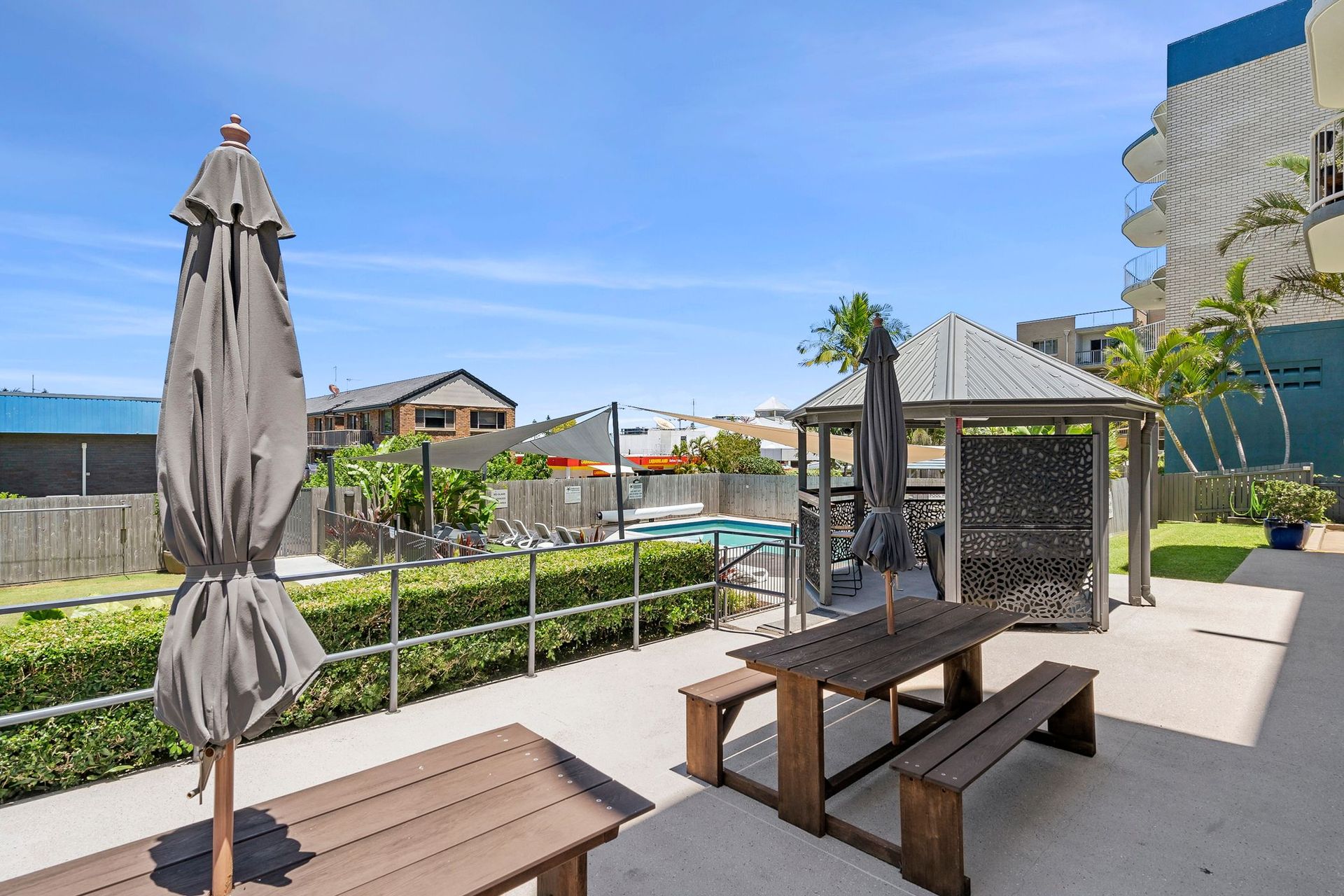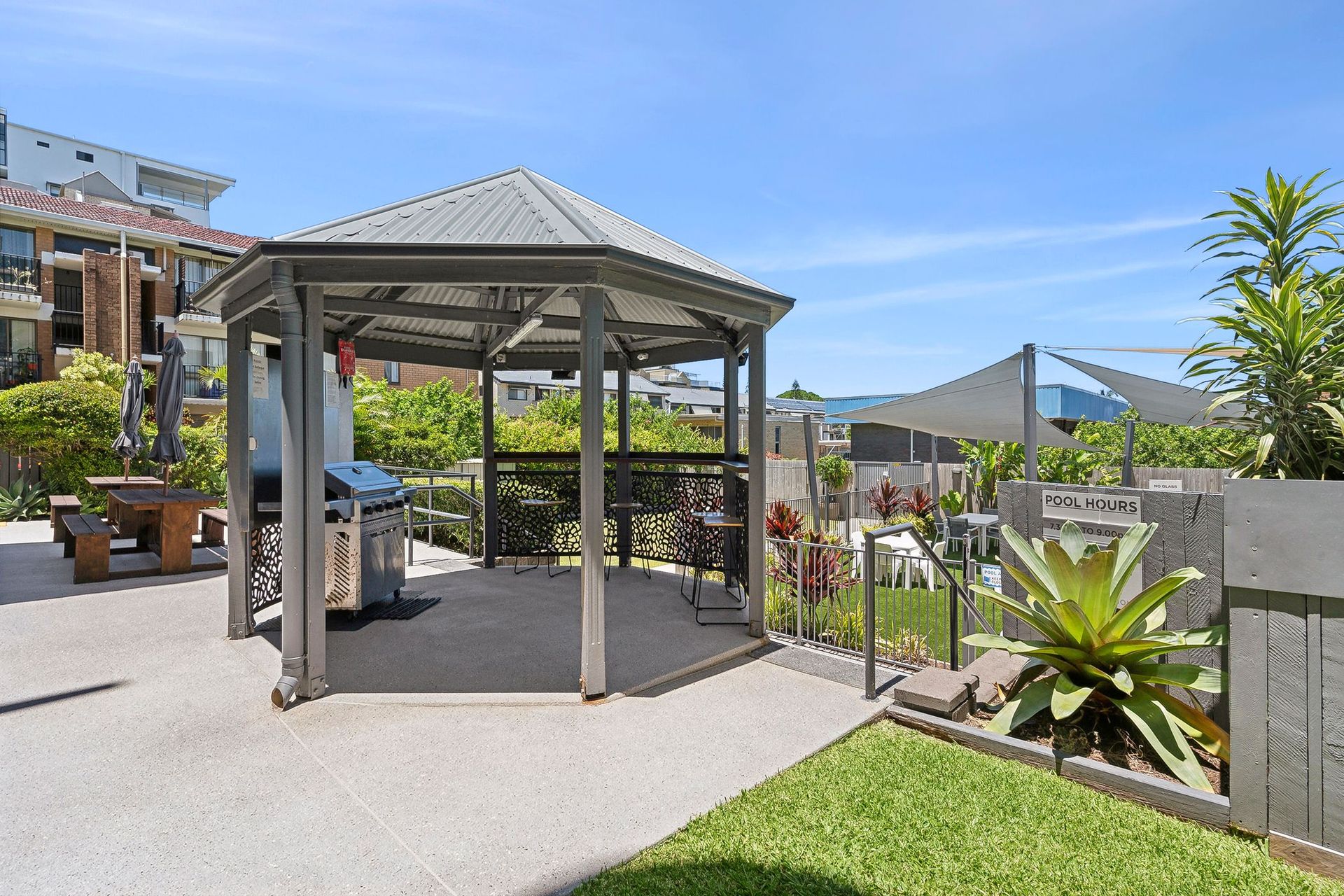 Outside, the secure complex provides a swimming pool, a communal BBQ area with shaded seating, and a grassed play space for guests. A private gate offers direct access to Kings Beach, making it easy to enjoy the sun and surf.