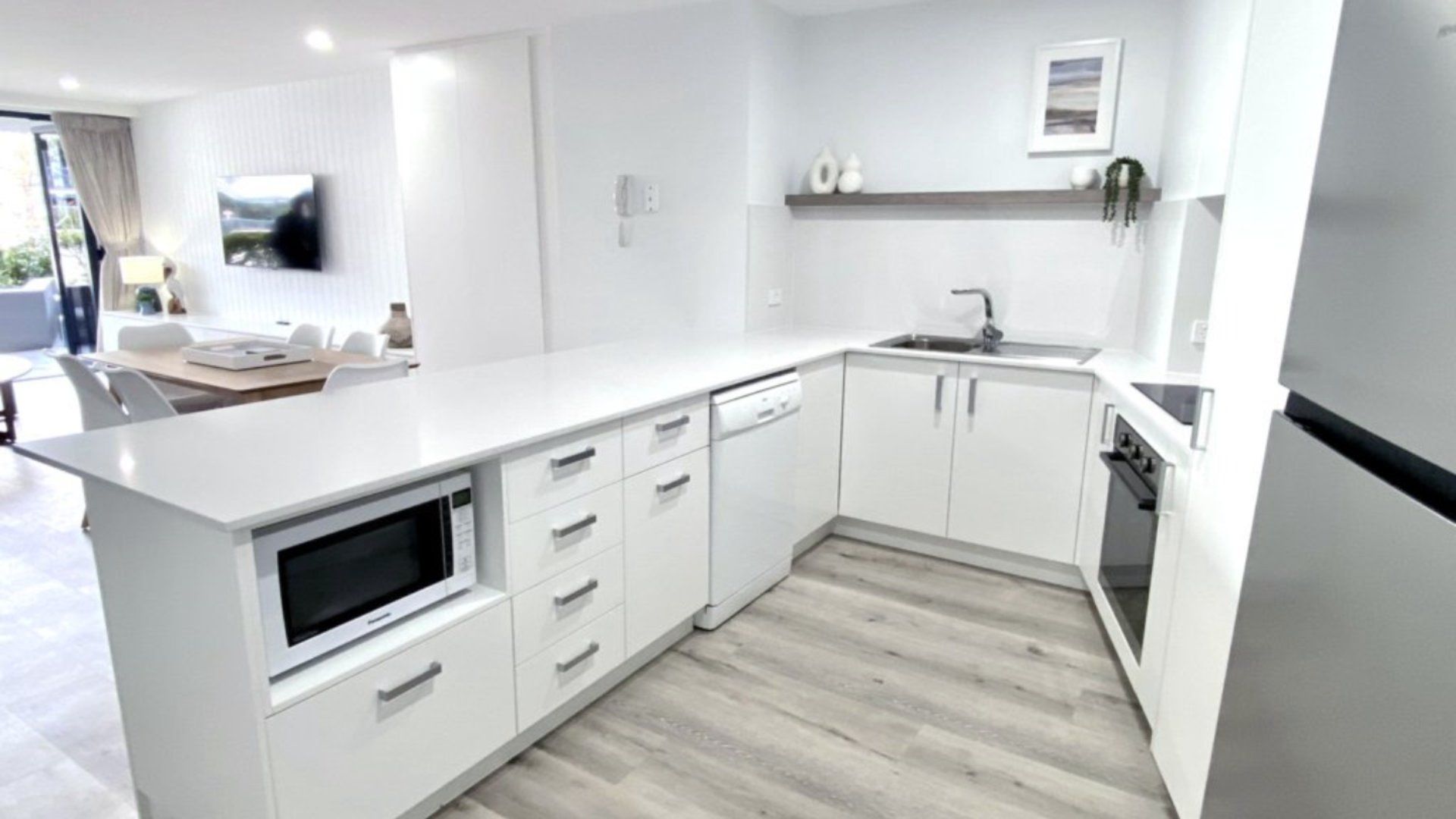 You can sit back and relax while watching the passing parade of watercrafts including sailboats, kite surfers, paddle boarders & more, right from your shaded patio. This unit is also conveniently located near the heated pool and grassed area making it an ideal location for families with small children offering direct access to the resort pool and spa as well as the shared BBQ area. This Unit will accommodate up to 6 guests in a King, 2 King singles and sofa bed. The master bedroom with ensuite and an additional bathroom & separate laundry with top loader washer + dryer.