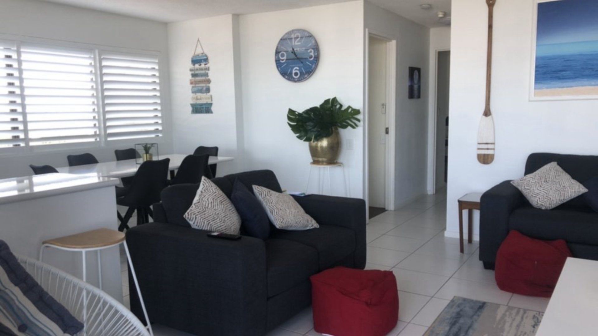 Unit 24 in K.I.G Heights offers a modern interior coupled with panoramic ocean views over Kings Beach and Bribie Island. Watch the ships sail by... or you might even spot a whale in the Winter time. This complex has a lift, a pool and a secure lock up garage. It is located on level 5. The unit will comfortably sleep your family of 4 in a Queen and 2 singles + there is also a Queen sofa bed in the living area for an extra 2 if needed. K.I.G Heights is approximately 600 metres to the patrolled area of Kings Beach (about a 7 minute or less walk). You are also close by to Moffat Beach (a 2 minute drive). There are plenty of places to eat and drink in Kings Beach within walking distance - The Surf Club, The Tavern + more.