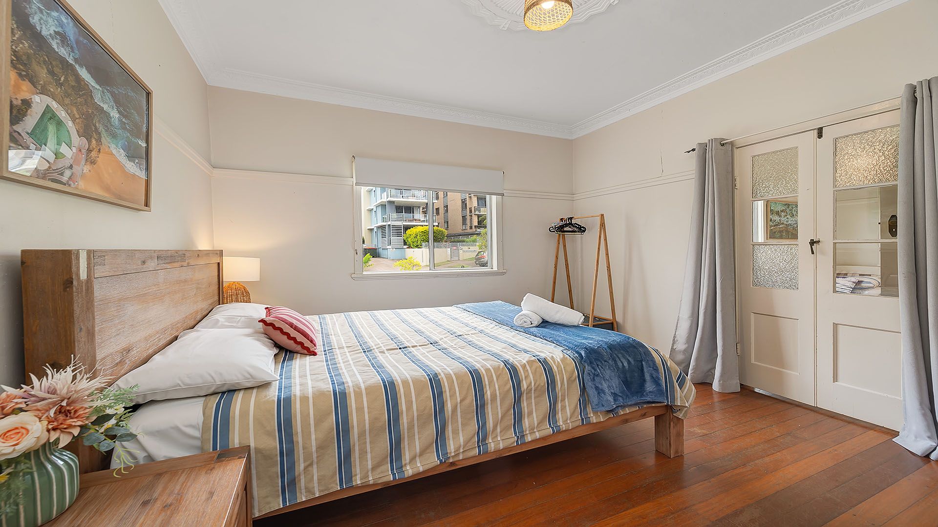 Well-thought-out and comfortable interiors with mostly new furnishings, including a stylish rattan dining set and leather couch. Classic ornate ceilings and abundant natural light create a warm and inviting atmosphere. - 2 x Smart TVs for your entertainment needs (sign in with your home account to access Netflix, Stan, Disney Plus, and more). - Original wooden flooring for a touch of nostalgia. - Air-conditioning in the living room. - Free Wi-Fi for staying connected. - Off-street parking in the driveway (fits 1 vehicle, possibly 2 depending on size), with additional on-street parking available.