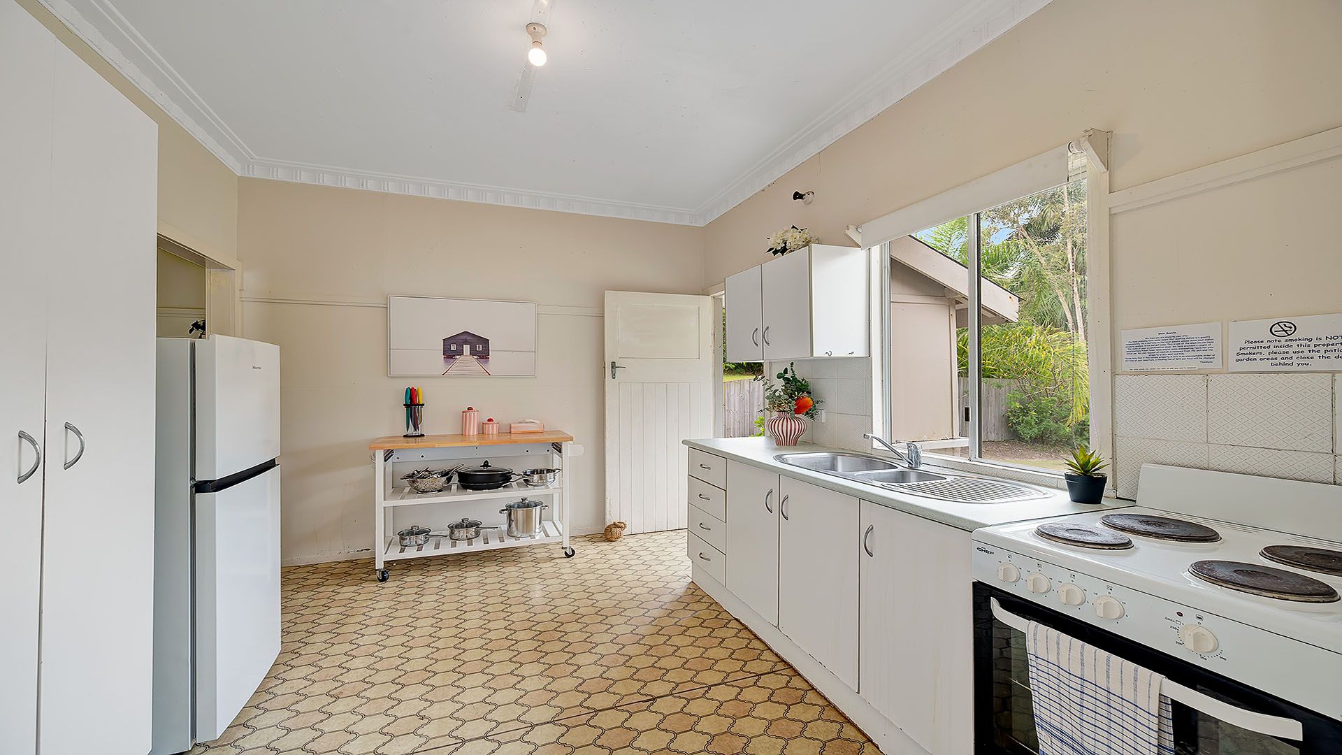 - Please note that the garage is not available for guests. - Retro/original bathroom with 1 toilet, shower over the bath tub, and a new vanity. - Original style, fully stocked kitchen with new appliances (fridge, stove top, oven & microwave - no dishwasher). Plenty of cupboard space for your goodies, and all new crockery, cutlery, and glassware. Tea, coffee, sugar, salt and pepper all provided. - A delightful, good-sized deck with table and chairs, overlooking the spacious backyard adorned with charming fairy lights. - Washing machine located under the house (in an older section). - No dryer, but there's a full-length clothesline in the backyard and an air dryer for indoor use. - A welcoming, light-filled sunroom at the house's entry. - Pets are welcome outdoors only. - Free Wi-Fi for staying connected. - Pets are welcome outdoors only. - Highchair & Portacot supplied.