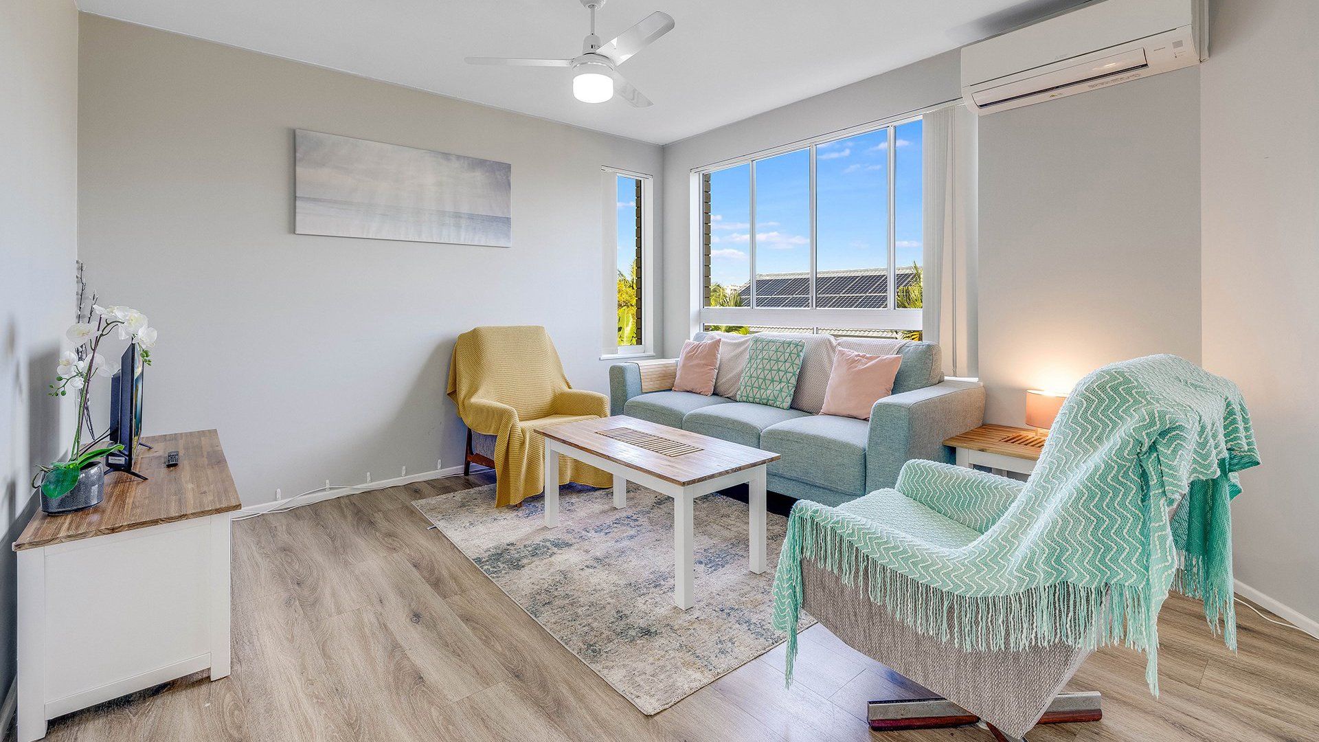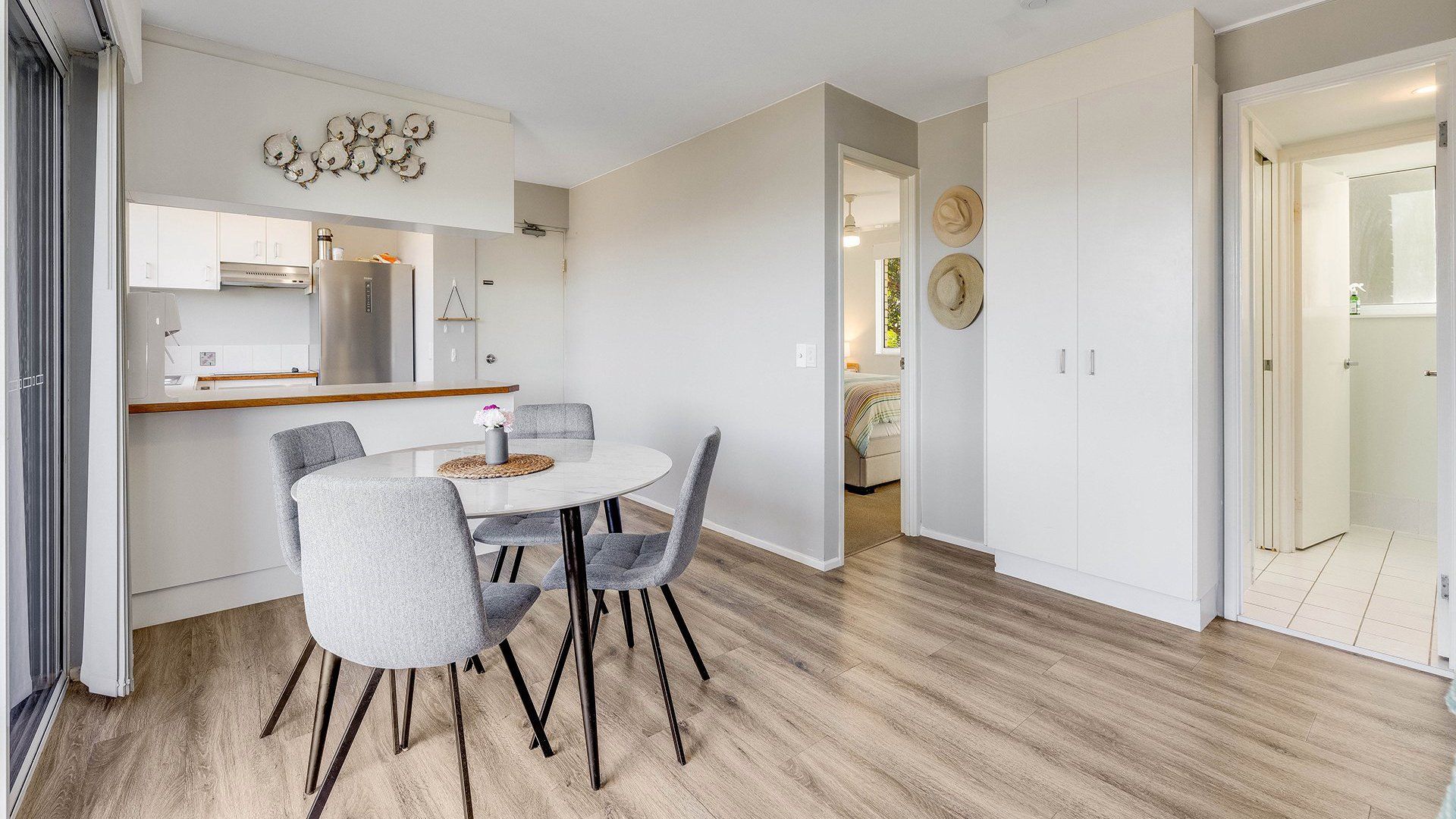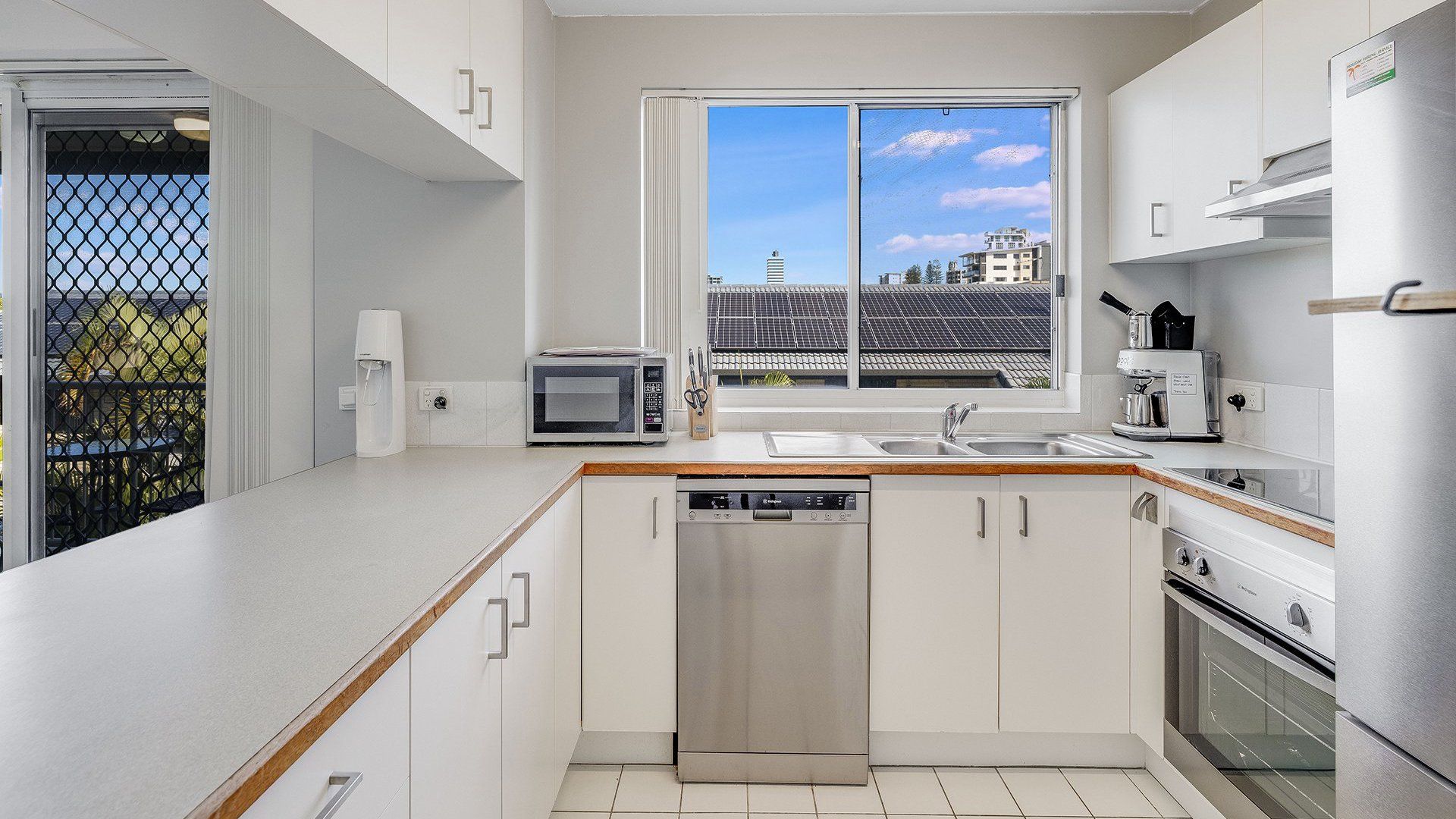 It will accomodate 4 guests in 2 Queen beds, with a two-way bathroom off of the main bedroom. The living area offers a light and airy space with TV and air-conditioning. The kitchen is self-contained with a dishwasher, microwave coffee machine and soda stream. The unit is fitted with a water filter for all taps in the bathroom and kitchen.