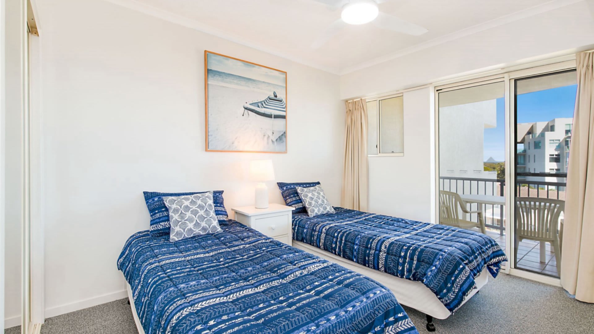 The spacious master bedroom overlooks the ocean with ensuite and has a wall mounted smart TV with Netflix. The second bedroom has 2 single beds and a balcony with views of the Glasshouse Mountains.